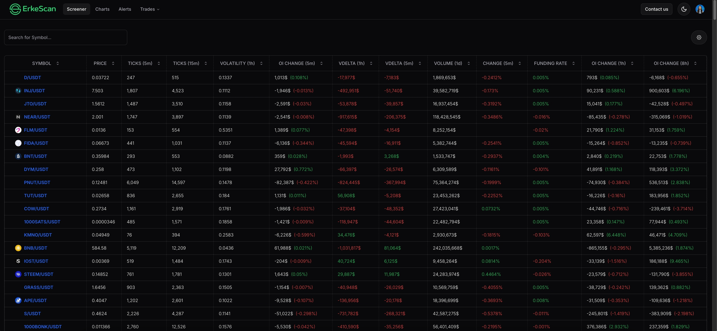 ErkeScan — это платформа для анализа криптовалютных рынков, созданная для активных трейдеров, ищущих высокоэффективные торговые возможности. Система анализирует данные в реальном времени с биржи Binance (в будущем планируется подключение других бирж) и выявляет потенциальные точки входа с помощью расширенных метрик, включая открытый интерес, дельту объёма, изменение цены и многое другое.